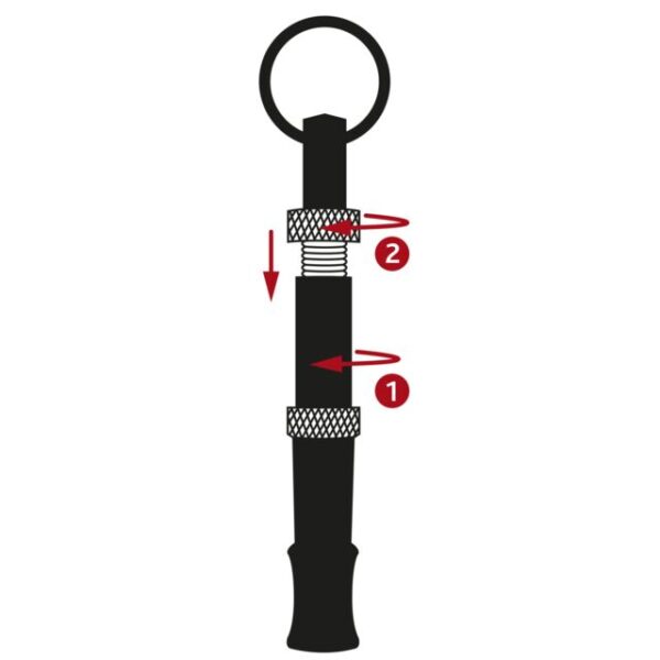 El tono del silbato de alta frecuencia se puede ajustar individualmente. Para establecer el tono que mejor se adapte a su perro, puede ajustar el extremo del silbato (1). Una vez alcanzado el tono deseado, gire el tornillo de bloqueo (2) hasta el tope en el extremo del silbato para asegurarlo.